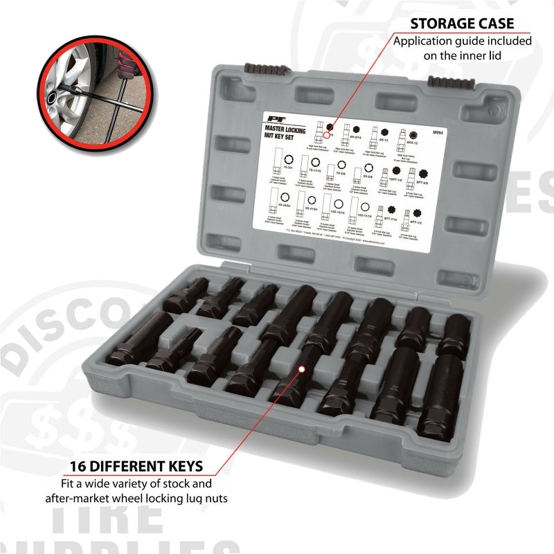 - 16 different key shapes to fit a wide variety of stock and after-market wheel locking lug nuts