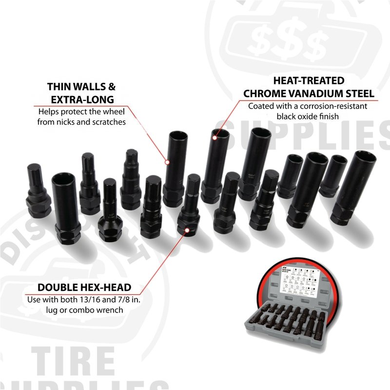 Unlock any locking lug nut with this master key set that includes 16 different key shapes. Made of chrome vanadium steel.