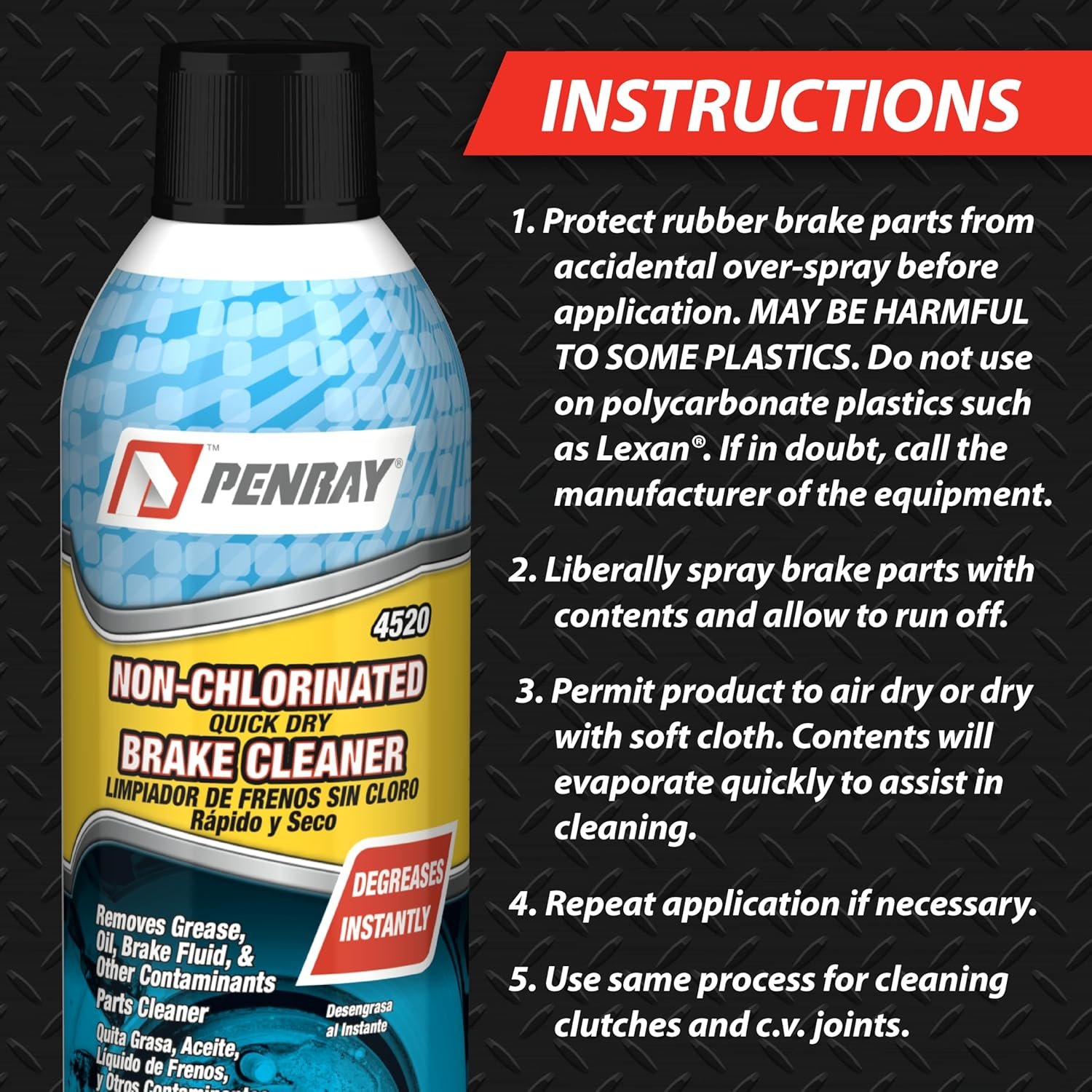 High VOC formula. Quickly and effectively dissolves and removes grease, oil, brake fluid, and other contaminants from brakes, C.V. joints and clutch components. Superior cleaning power extends beyond brakes. Cleans and degreases brakes, rotors, drums, pads, shoes, wheel cylinders and parts. Help stop brake squeaking and can improve braking performance. Leaves no residue.