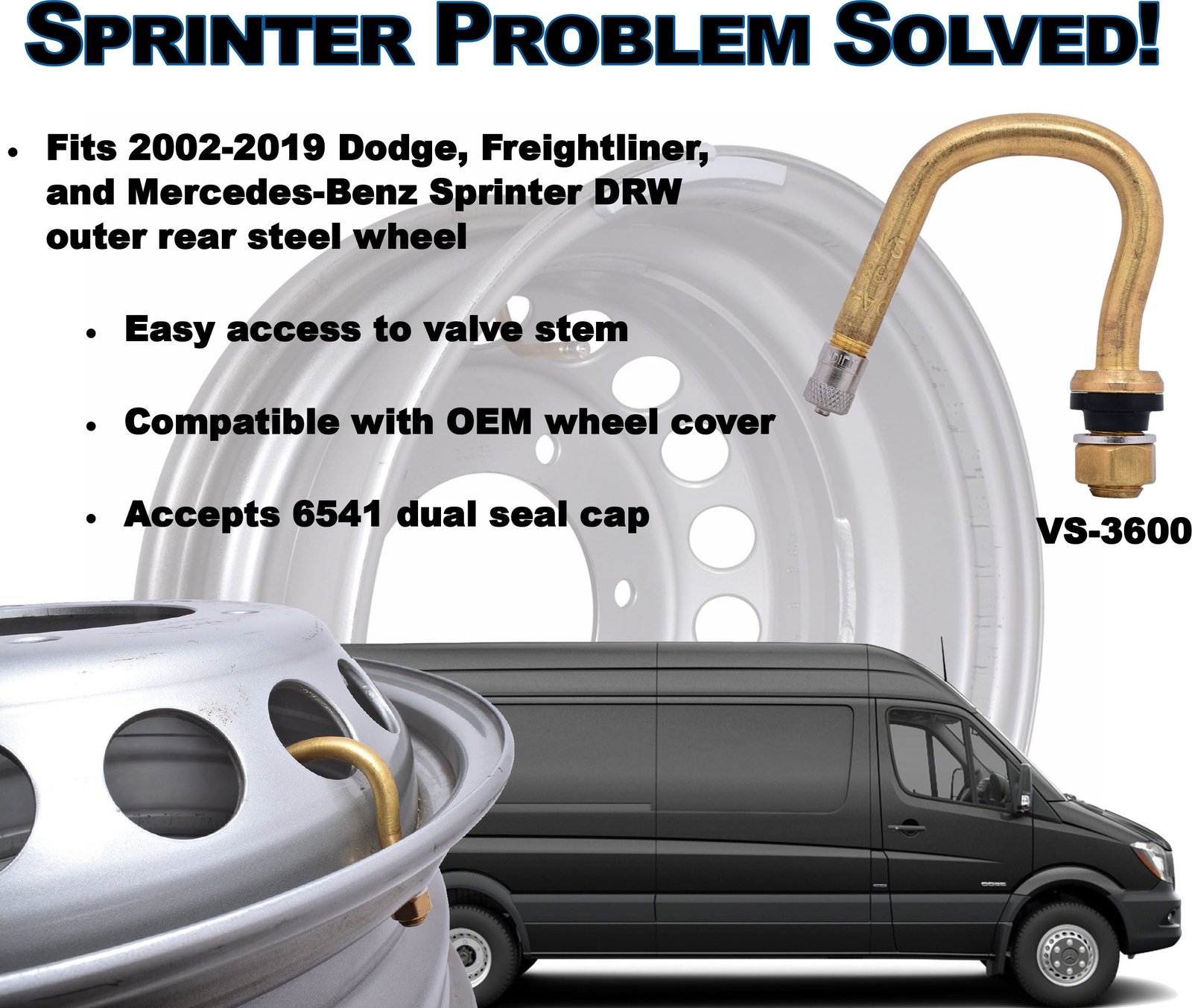 Do you need a replacement valve stem for the outer rear dual wheels (Dually) on your Dodge, Freightliner, or Mercedes-Benz Sprinter van? The Dill VS-3600 valve stem is designed specifically for these vans with Dually wheels. It has a hooked shape for easier access when inflating the tires and is made to work with the original equipment manufacturer (OEM) wheel cover and 6541 dual seal cap to ensure a proper fit without interfering with the cap or cover.